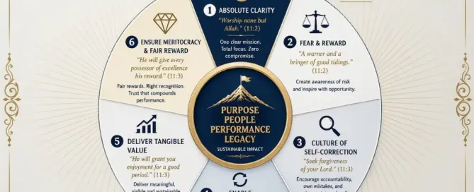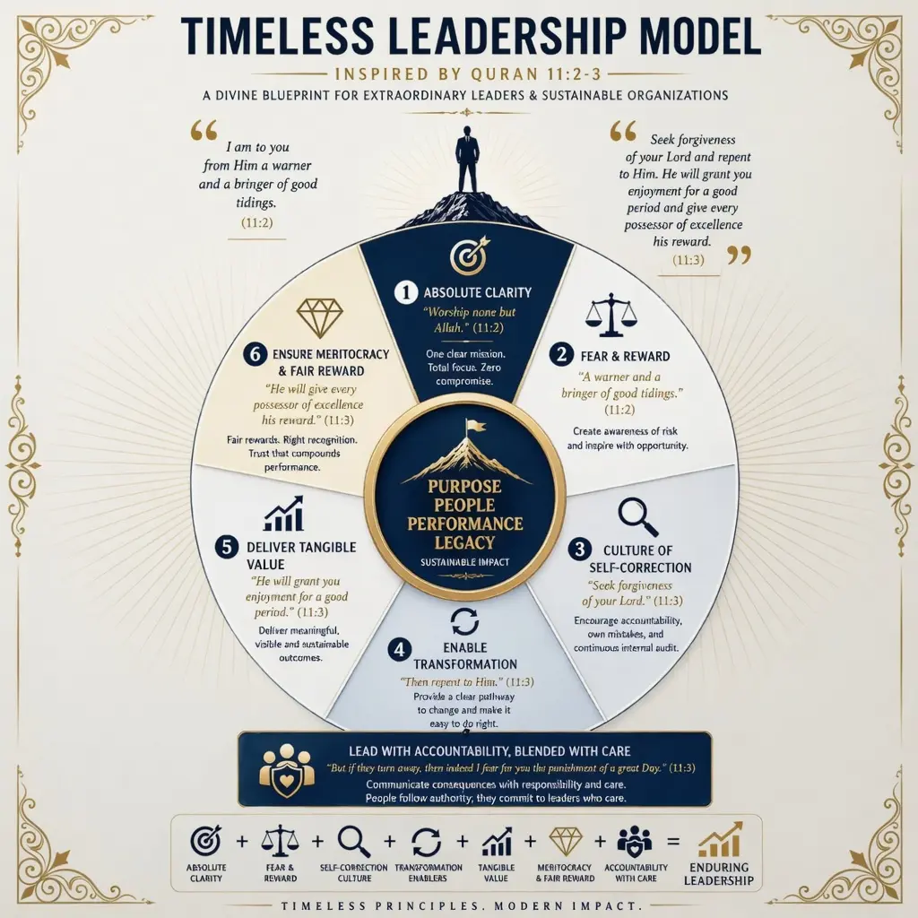 One of the most complete leadership models was presented centuries ago in the Qur’an (Surah Hūd 2–3). Its brilliance lies not only in spirituality, but in its precision of strategy, psychology, and governance.Here is what it teaches us—at a C-suite level:1. Absolute Clarity of PurposeGreat leadership begins with an uncompromising core. Not ten priorities. Not